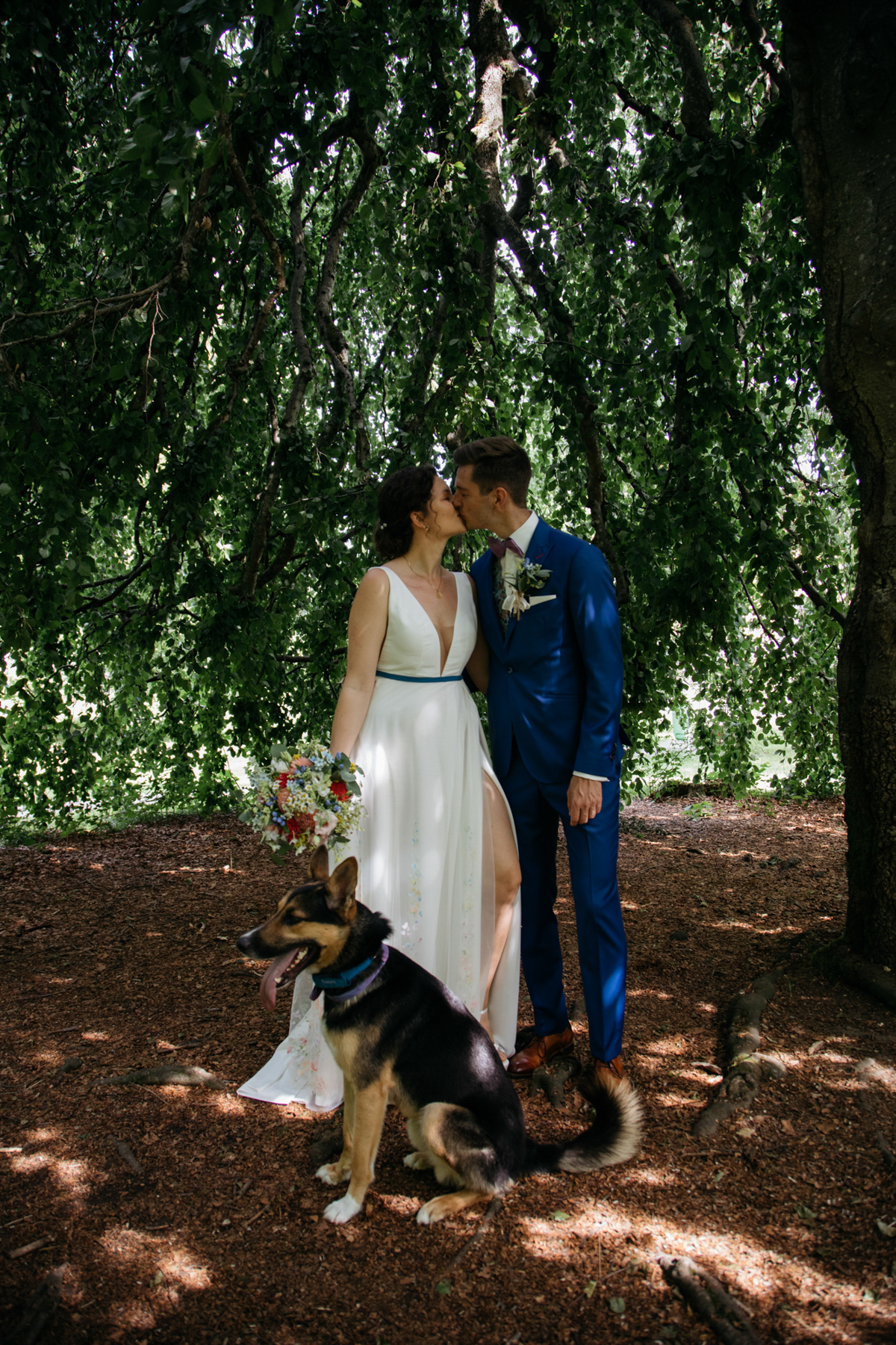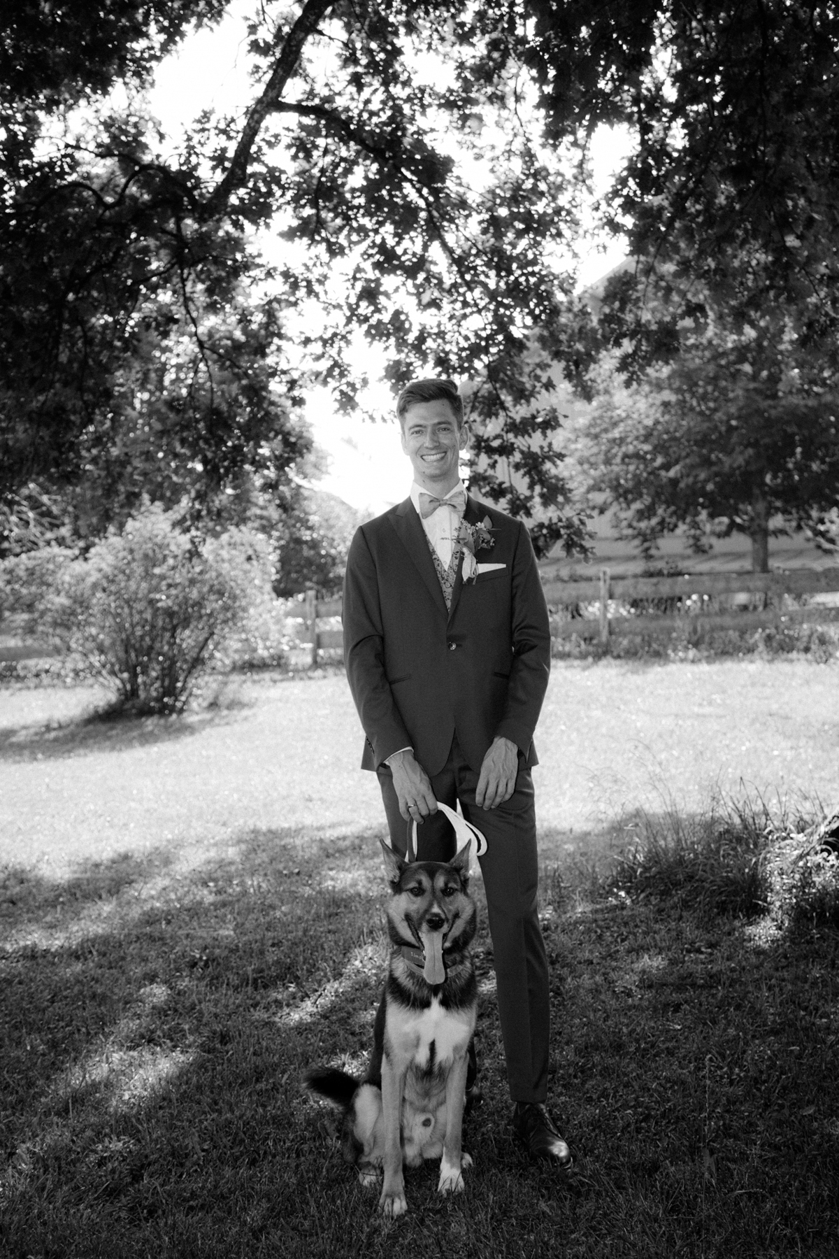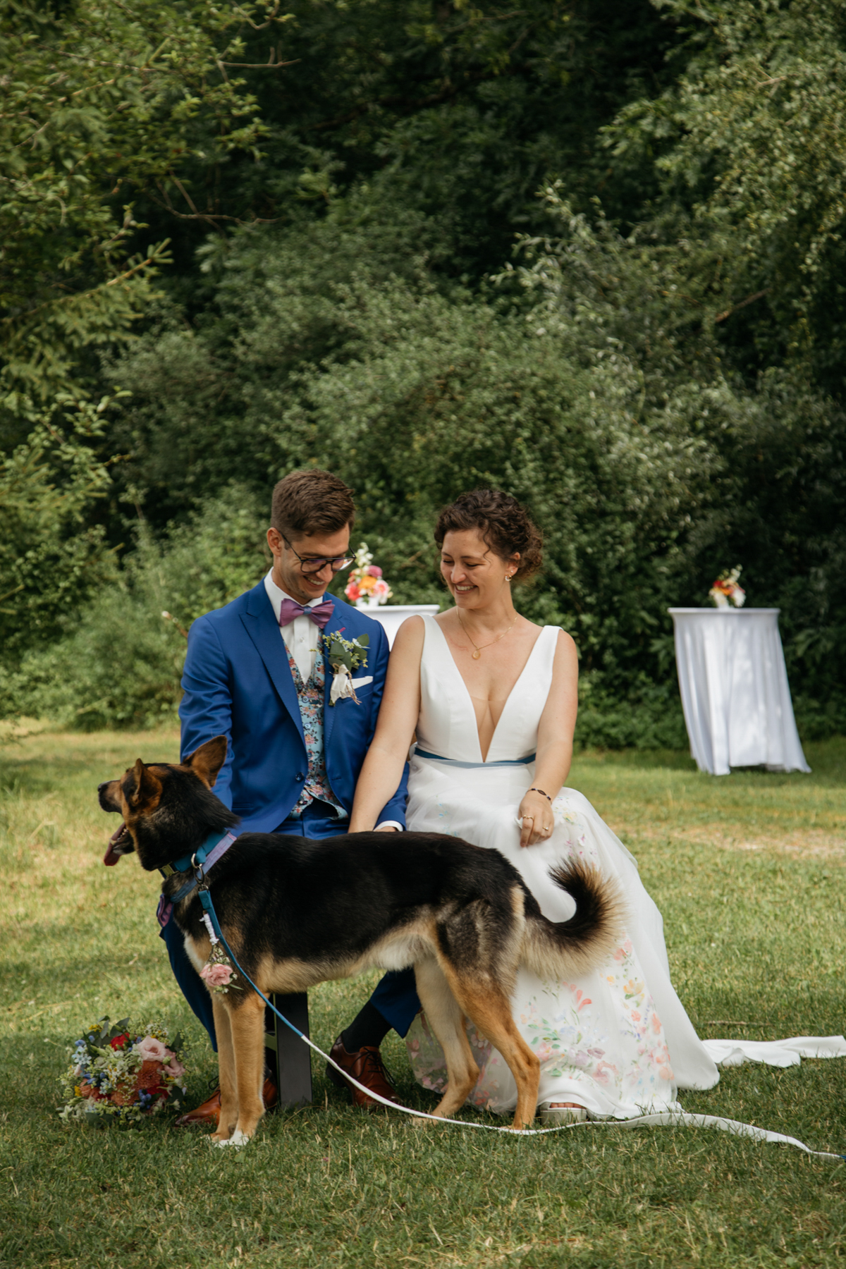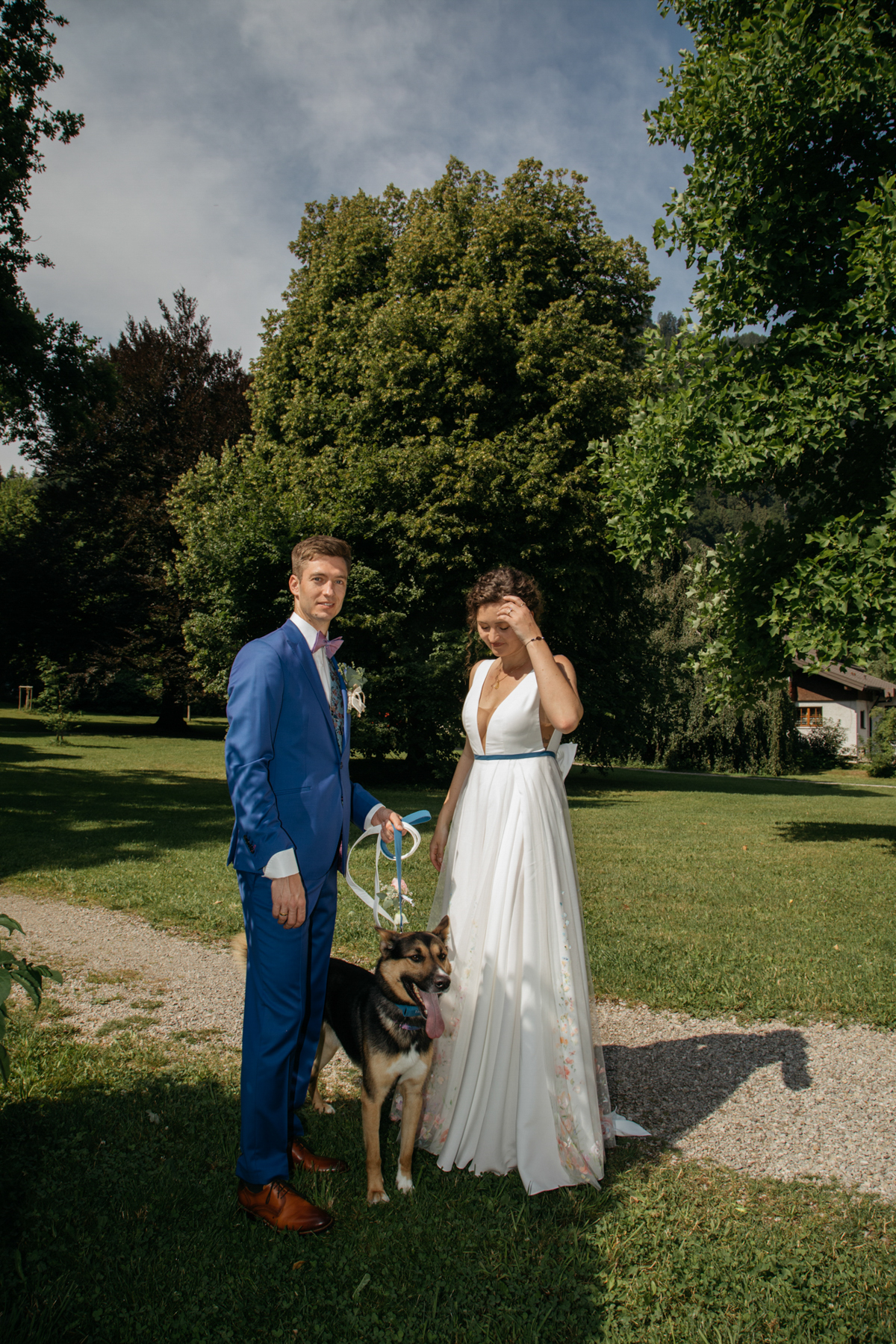 Vorher habe ich an der Musikschule Immenstadt Bilder von dem Liebespaar gemacht. Hier sahen sich die beiden zum ersten Mal im Hochzeitsgewand. Beim "First Look" durfte Hund Timon natürlich nicht fehlen.