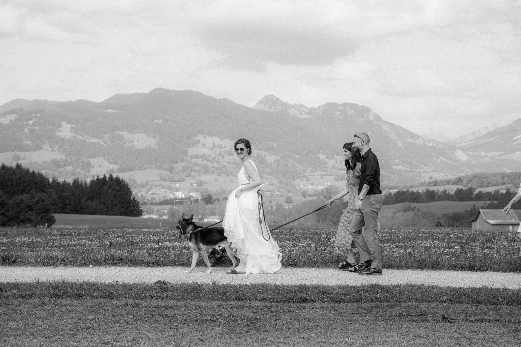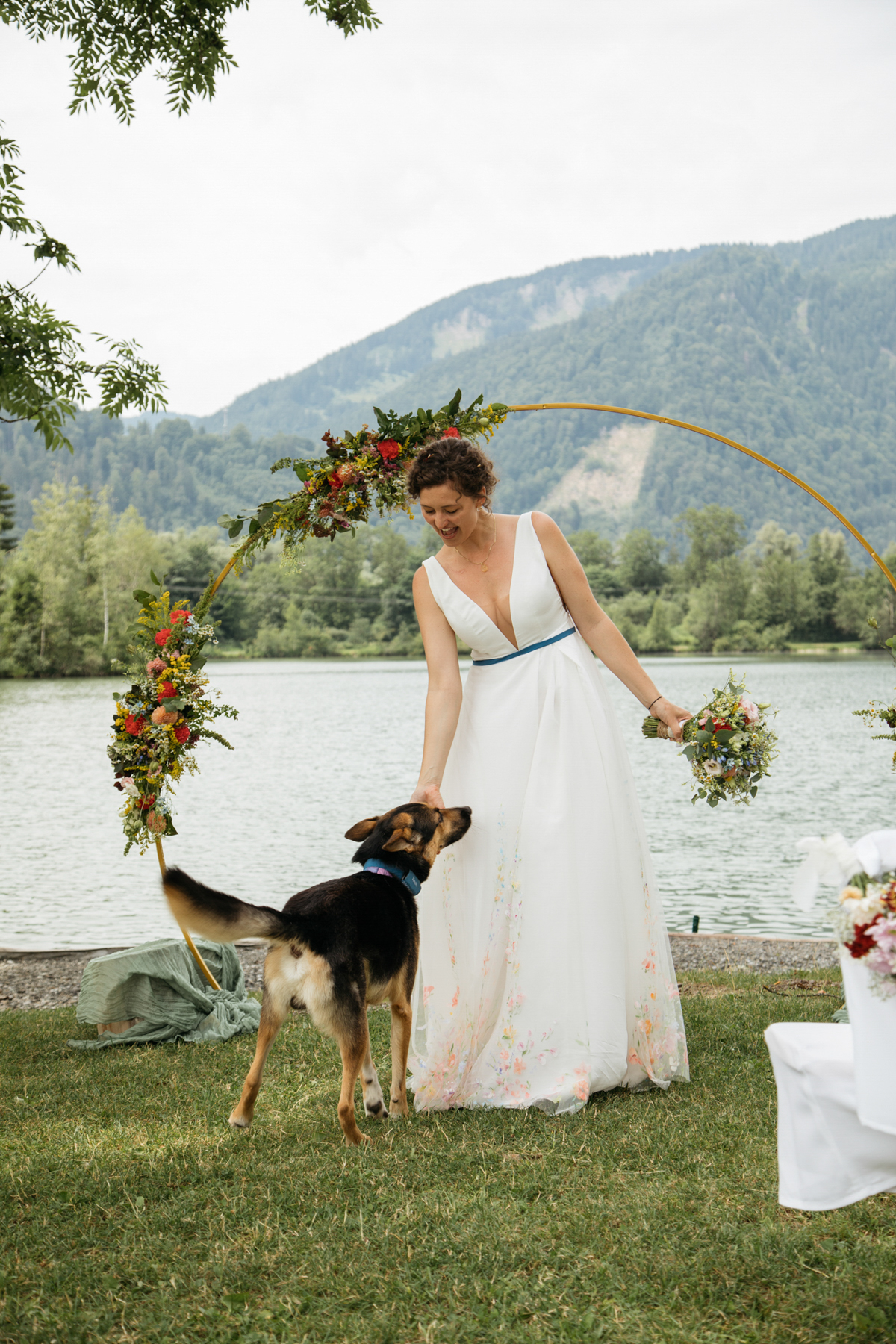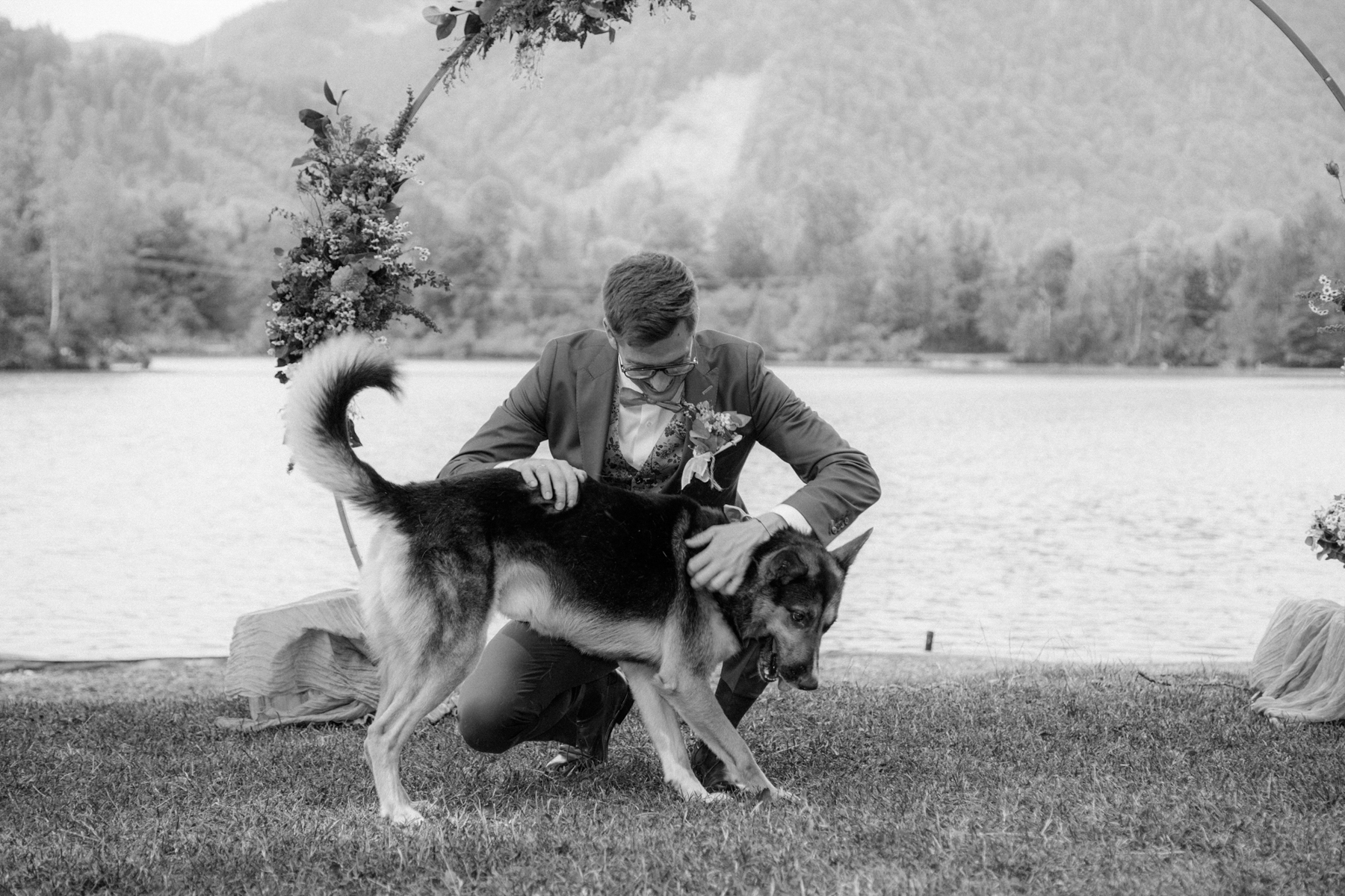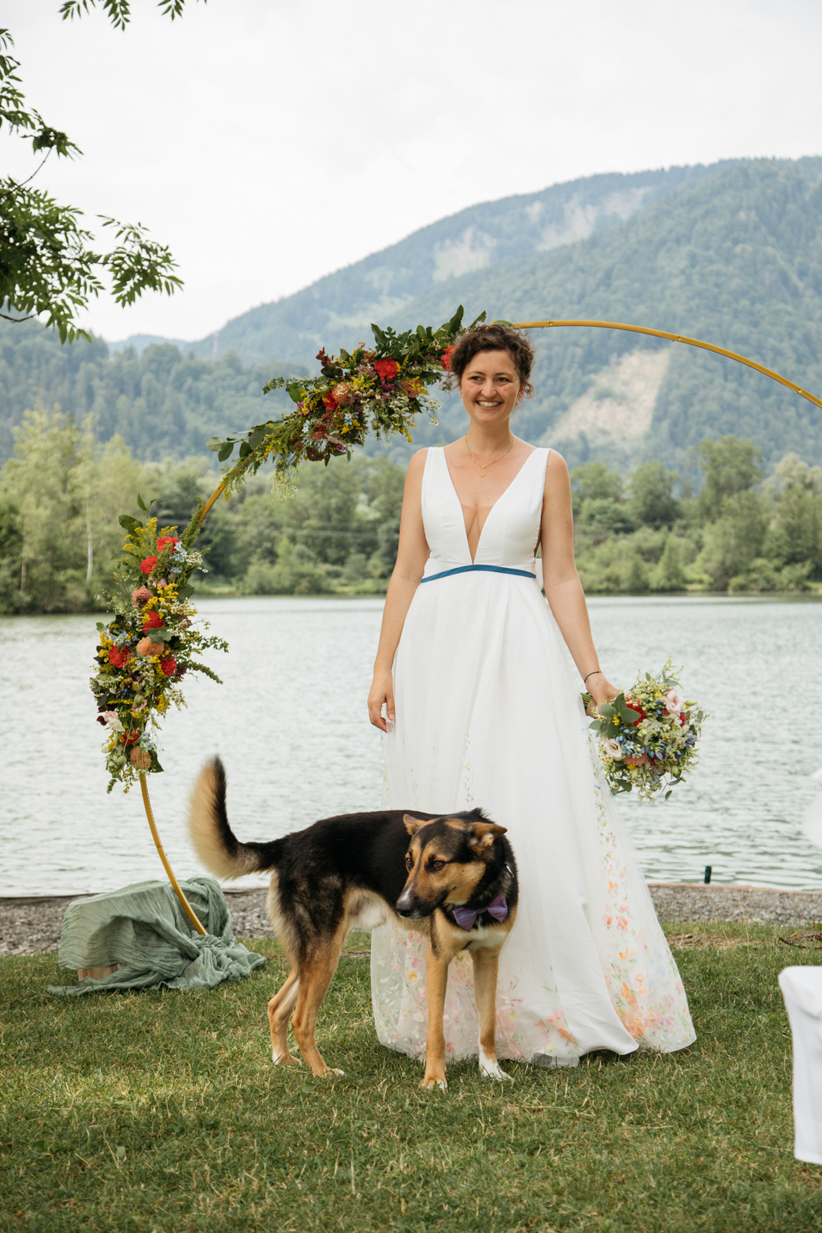 Vorher habe ich an der Musikschule Immenstadt Bilder von dem Liebespaar gemacht. Hier sahen sich die beiden zum ersten Mal im Hochzeitsgewand. Beim "First Look" durfte Hund Timon natürlich nicht fehlen.