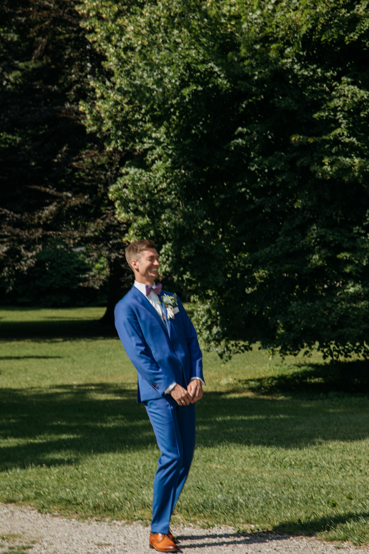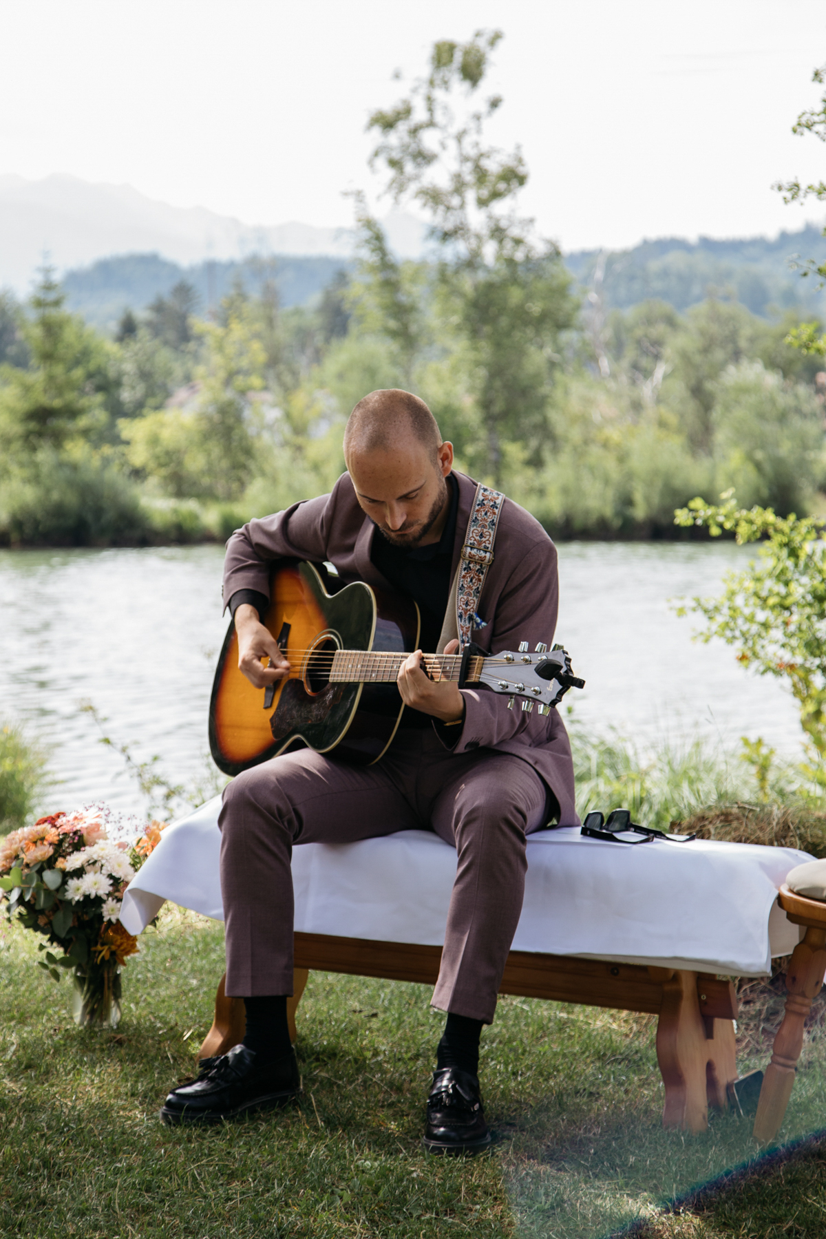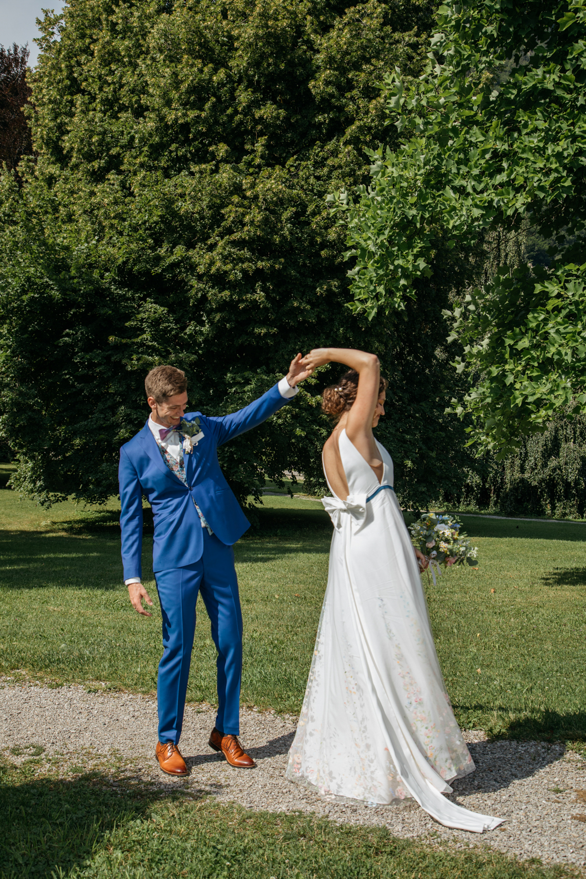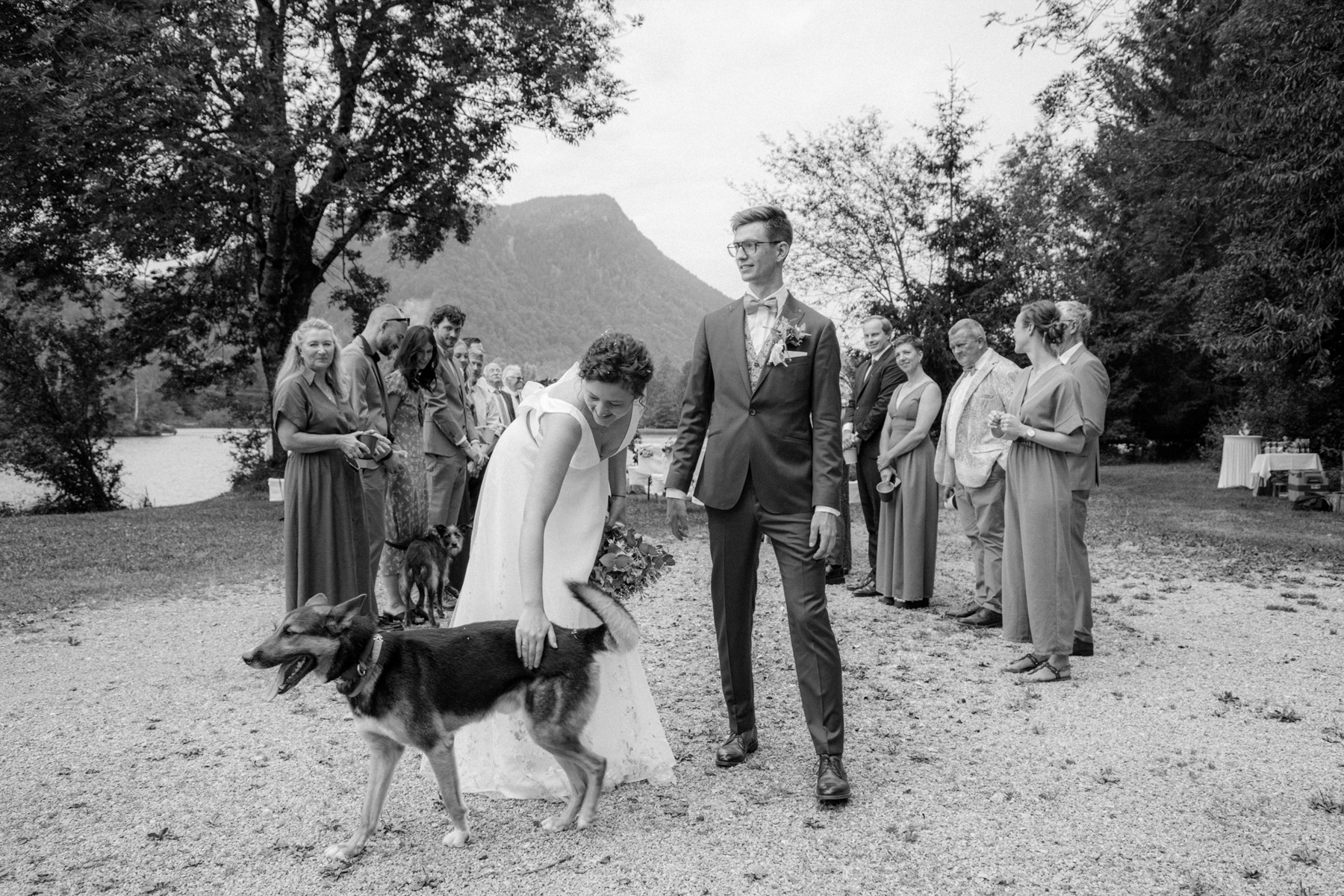 Vorher habe ich an der Musikschule Immenstadt Bilder von dem Liebespaar gemacht. Hier sahen sich die beiden zum ersten Mal im Hochzeitsgewand. Beim "First Look" durfte Hund Timon natürlich nicht fehlen.